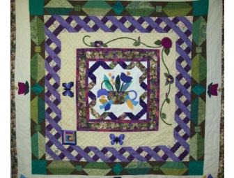 "Garden Party" 60x60" is machine and hand appliqued, stitched and quilted. The primary colors are Iris, green, moss and cream. Cotton, and silk fabrics, with cotton batting and backing. The quilt is signed by the artist. The subject is all things garden! Birds, flowers, fences, butterflies and leaves.. for a table top or to hang on the wall..