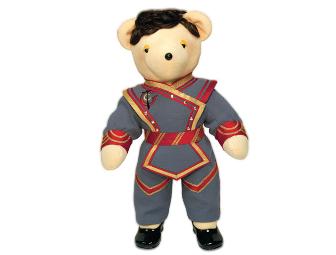 Follow me down the aisle of the Grauman’s Chinese Theater. So begins this loving tribute to 1930’s Hollywood directed by Tommy Tune. Broadway’s favorite Priscilla Lopez, hot off her success as Diana in A Chorus Line won a Tony Award for Best Featured Actress in a Musical. In Act 1 against Tony Walton’s brilliant set of Chinese red deco theater lobby doors each actor wore a slightly different 1930’s style usher uniform from Hollywood’s Grauman’s Chinese Theater. The costumes were designed by another original A Chorus Line cast member, Michel Stuart. Our bear is dressed in blue-grey wool crepe outfit with 30’s cut trousers (think Dietrich) and a Mandarin deco tabard. The costume is trimmed in gold bullion braid, handmade Chinese red bias binding, and tiny gold nail heads, and is emblazoned by the distinctive GCT embroidered logo in Chinese red and gold. Her face is framed by dark curls, and she has been lovingly rouged. She wears black patent leather Mary Janes, and we are sure you will agree “She’s the best!”