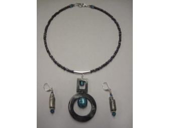Get ready for the compliments when you wear this beautifully crafted jewelry by Bobbie Berking Dalzell for B. Designs. This one-of-kind set includes a necklace and drop earrings designed with Mother of Pearl, Swarovski crystals, foil glass, silver and glass beads. This stunning silver and turquoise jewelry is the perfect accessory to add creative flair to any outfit. B. Designs, located in Providence, can be reached at 401-451-8205.