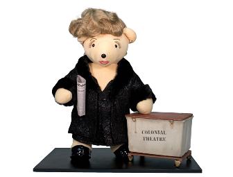 She may be the tough producer who has taken her show for an out-of-town tryout at Boston’s Colonial Theatre, but even with a version of “The New England Patriot,” which featured scathing reviews for her current show, still in her hand Carmen looks stunning in a stylistic replica of the black brocaded, empire waist dress worn by Debra Monk on Broadway. The outer shift coat is of the same black brocade fabric with added black faux fur trim collar and cuffs. All fabrics have been scaled down to match the scale of the bear. Ms. Bernstein’s hair is swept up in a modified French Twist and silver bead earrings and salmon pink embroidered lips accent her face. A brass framed muslin stage hamper has been hand built to resemble the one used in the show and even has “Colonial Theatre” stenciled on both sides although from the reviews of “Robbin’ Hood,” we are not sure how long the show will run! Ah well “It’s A Business” and “Show People,” such as Carmen, will make sure the show goes on!