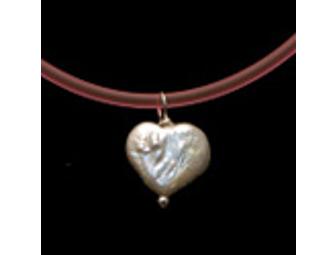Freshwater pearl heart pendant on pink rubber cable, handcrafted and designed by Amy Neukrug of It's a Girl Thing.
