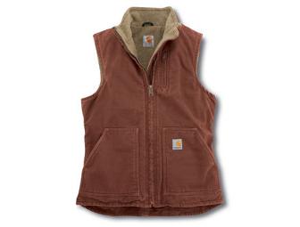 You'll keep nice and warm with this Women's Carhartt Sandstone Vest in a rust color. It designed to fit the shape of a woman. It is is Sherpa lined in the body and front pockets for added warmth and has inside pockets for secure storage.