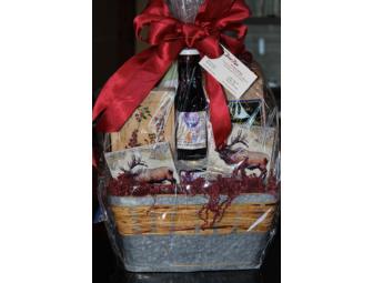 This basket includes food items made in Jackson Hole, WY. It has things like huckleberry syrup, buffalo jerky, pancake mix and salsa.
