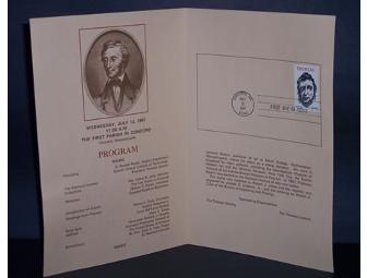 Program for the Henry David Thoreau Commemorative Stamp Program from Wednesday, July 12, 1967 held at The First Parish Church in Concord, MA. Program measures 9" x 12" flat or 9"x 6" folded. Includes stamp with First day of issue cancellation.