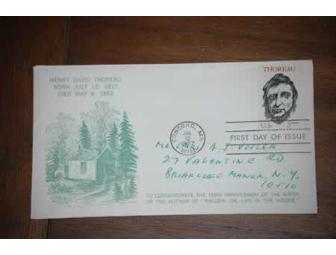 This First Day of Issue envelope and stamp has a picture of Thoreau's cabin at Walden Pond. The envelope was printed for the Thoreau Foundation of the Thoreau Lyceum. At the time this 5 cent stamp was issued by the Post Office in Concord on July 12, 1967 its depiction of Thoreau by Leonard Baskin was controvercial, to say the least. Mary Sherwood called it a "desecretion" -- "a disregard for good taste and historic appreciation...." But over the years Thoreauvians have learned to appreciate it. The donor will pay the cost of shipping.