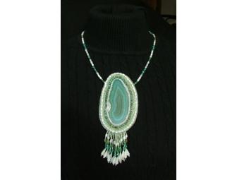 This bead embroidered necklace will take you to the tropics without ever boarding a plane! This serene piece is composed of an agate slab surrounded by a variety of beads sewn to ultrasuede including African Turquoise, Mother of Pearl., Japanese seed beads and Czech glass. The pendant is 2 1/2" wide x 6" long (including the fringe) and the neck chain is 18" and closes with a toggle clasp. The pendant is backed in buttery soft ultrasuede. Tide Pool is a one of a kind treasure designed and created by the donor.