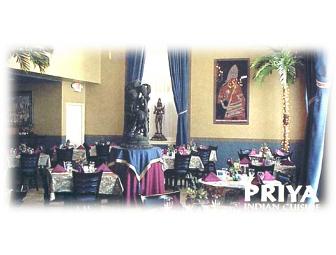 Experience the memorable cuisine and atmosphere at Priya Indian Restaurant for the first time or simply enjoy what you already know will be a great meal with these two $25 gift certificates.