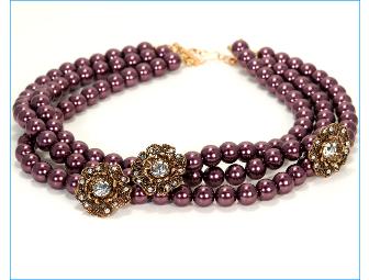 This three-strand, wine-colored faux pearl choker is finished with three vintage antique gold-plated and rhinestone flower pendants. Choker is approx 16 inches in length. Flowers are 25mm in diameter.