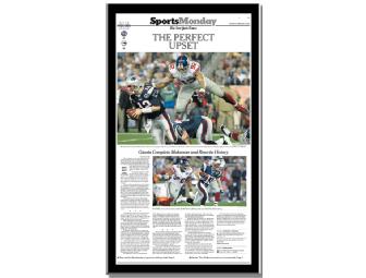 Reprinted sports page from the national edition of The New York Times on February 4, 2008, featuring a great photo of Michael Strahan bearing down on Tom Brady during the Giants' Super Bowl victory over the then undefeated New England Patriots.
