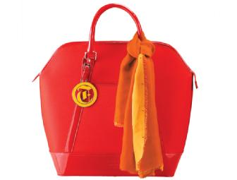 The tote bag is made of sturdy twill and patent spatzilato leather in a bold red. On the inside, a polyester, laminated tangerine lining for durability and a 100% cotton dust bag for storage. Comes with a Times signature nickel medallion, an attention-grabbing accent. The tote measures 15.5" high, 19" wide (at top) and 8" deep, with a 4" strap drop.