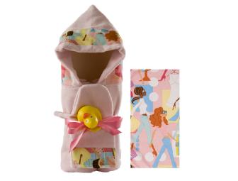 Fashiongirl hooded towel set is Karin Alexis' most popular baby item. This roomy 60" x 32" towel with attached hood is perfect for newborns and will fit through the toddler years. Made of 100% cotton. It comes with wash mitt and starter rubber duckie. MADE IN NYC!