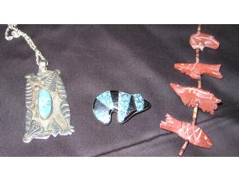 These beautiful authentic and recently appraised pieces of Native American jewelry were collected by a true lover of vintage Southwestern items. Features a totem bear "bar" pin that can be turned into a pendant with the embedded ring, a carved series of animals on a beaded string, and a silver and turquoise pendant on a silver link chain.