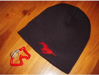 Black Beanie with red embroidered Mustang, and a carabiner style red Mustang keychain.