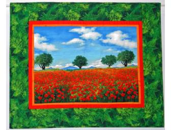 This landscape panel is machine quilted and thread painted, with two bright sashings and a leafy batik border quilted with highlight thread.