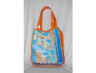 Hand-sewn small orange and blue tote made from discarded vinyl signs and banners. 12 in. wide by 13 in. tall.