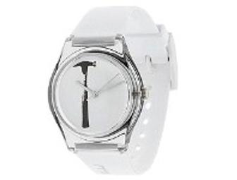 Culled from the "Nothing Special" collection (the name of which comes from the TV show about nothing that Warhol wanted to create), it features a screen print reproduction of a hammer set against a silvery gray background. The dial includes just two long hands (with seconds hand)--no numerals or hour markers. The plastic watch case includes Andy Warhol's signature on the stainless steel caseback (along with the quote "I like boring things"), and is complemented by a white plastic strap with a tapered profile. It also features water resistance to 50 meters--suitable for swimming but not for diving.