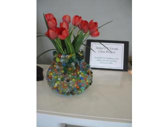 A beautiful and one-of-a-kind creation! This glass vase is affixed with antique marbles chosen by the Haley's 1st graders under the guidance of parent volunteer Randy Moore.