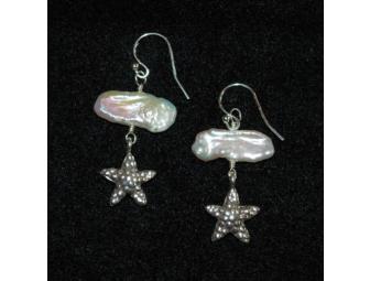 Whimsical silver starfish, handcrafted in Thailand by Hill Tribe artisans, dangle beneath luminous freshwater pearls. Sterling silver earwires comple the pair.