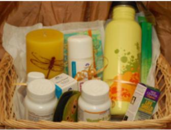 A bountiful gift basket from Way of Life including a Kleen Kanteen water bottle, dragonfly candle, Dermae natural facial cleanser, CleanWell natural hand sanitizer, multi-vitamins and Vitamin D Sunny Gummies, Magnifiscents incense, butterfly journal, Life Shield peppermint throat spray, SPF 15 lip balm, breath mints, and coin purse!