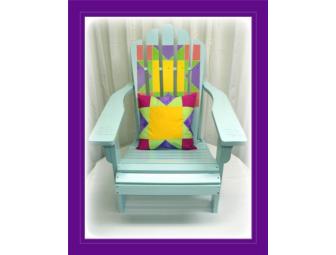 This quilt inspired chair is painted in colors of purple, green, yellow and pink with a background of light blue. The arms of the chair are adorned with the nursery rhyme "Star Light, Star Bright". A pillow with the same quilt pattern accompanies the chair.