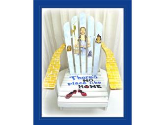 My chair is a fairly literal interpretation of the theme, from the perspective of the “Wizard of Oz”. It depicts Dorothy on the back, looking off into the distance, surrounded by small illustrations of the Cowardly Lion, Scarecrow and Tin Man. The seat is decorated with the theme, and the ruby slippers Dorothy used, along with this saying, to take her back to Kansas. The arms of the chair depict the yellow brick road; they attach to the back of the chair, so in this case we are taken by the road to Dorothy, rather than to Emerald City. We empathize with her initial yearnings for a better place and a brighter future, while we realize, as she did, that our “roots” always ground us, guide us, and make us who we are.