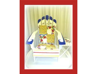 I was inspired by some fabric given to me by a friend as well as by my favorite place in Michigan, the Leelanau Peninsula, which is Cherry Country. The chair was great fun to paint and to accessorize as well with the cherry rug and side table that I found online! This project would not have been possible without the support and help of my husband, Dave. He assisted in the base coats on the chair and helped me not to panic when I had to cut into that “one-of-a-kind” fabric for the cushions!
