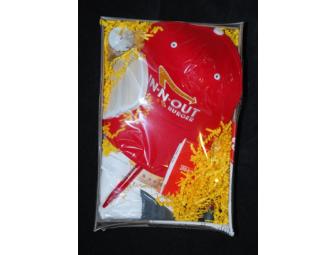 | In-n-Out Burger gift basket including a t-shirt, flashlight, pen and Post-it notes, baseball cap, antenna topper and two (2) guest check meal certificates. |