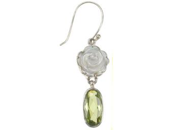 A beautiful pair of mother-of-pearl flower, green gem sterling silver earrings.