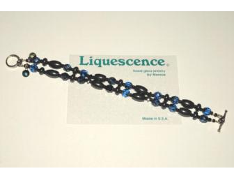Hematite (iron ore polished), fire polished beads and dichroic fused glass bracelet. Monroe V. Davids of Twin Birches Studio has worked with glass for over 35 years, and has been involved with fusing for over 20 years. He incorporates dichroic glass in all his pieces as it offers a third dimension, where the colors bounce all over the spectrum. Dichroic glass and its patterns are actually a film, which was placed on a layer of glass under intense heat and controlled high energy. His art pieces are known as “Liquescence” – the liquid essence of high-energy glass.