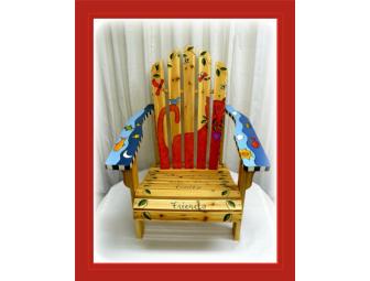 Cat lovers will adore this chair with wood burned designs and painted with colors of blues and reds with black and white striped edges. Three cats decorate the back of the chair and fish are along the arms.