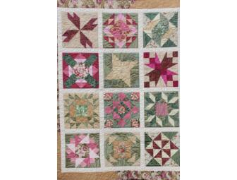 This quilt is a twelve block "sampler." Each block is unique and individually quilted. The palette ranges from the palest of pink to deep forest green. A combination of silk and cotton is used to add touches of Asian elegance. The size is 48" x 60."