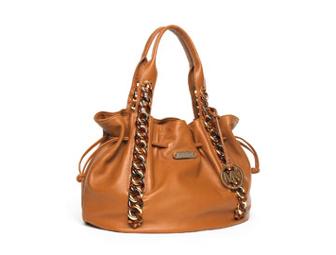 Michael Kors ID Chain Tote - Walnut leather. Michael Kors says every woman should have a luggage colored bag in her wardrobe. This bag would be the perfect addition. It is a beautiful leather with golden detailed hardware. The top handles have chain details cinched with side drawing pulls and topped off with the hanging logo charm.