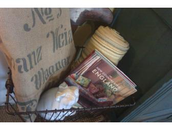 A gorgeous gift basket from Saffron & Genevieve in Santa Cruz.  Basket includes a jute rug, cotton throw, book and ceramic pig.