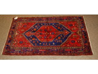 100% wool pile Persian Rug. Approximately 50 years old. Woven in the city of Hamadan. Rug is 4.02 Feet x 7 Feet. Geometric Design.