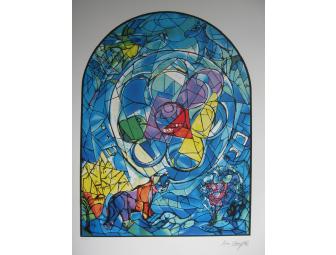 Limited Edition (numbered) silk screen of Marc Chagall's stained glass window at the Hadassah Hospital in Jerusalem, made by Marc Chagall and signed by the Chagall estate. This depicts the Tribe of Benjamin, one of the twelve tribes of Israel made by Marc Chagall in stained glass windows. The overall size is 33" by 25"