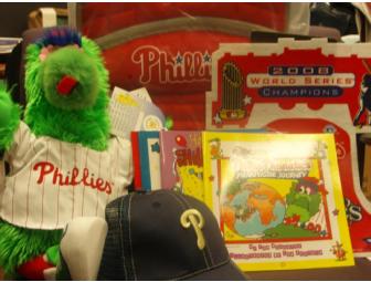 Phillies Phun basket filled with the Philly Phanatic (from Build-a-Bear), four Phillie Phanatic children's books, 2008 World Series Champions Penant, Phillie's Ryan Howard Hat and a Carlos Ruiz backpack.
