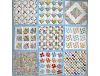 Five inch mini traditional quilts put together to make an exquisite wall quilt.  Beautiful traditional fabrics.  Hand quilted.