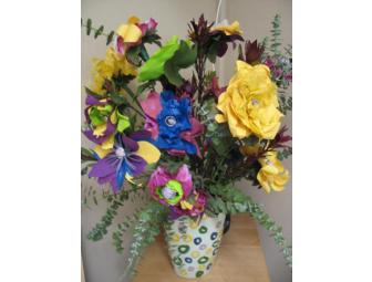 A flower vase, painted by Patricia's 2nd graders, filled with tissue paper flowers created by the children.