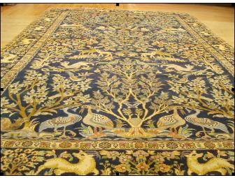 Hand woven Persian, 100% wool rug . Made around the 1940s and was influenced by 16 century design. This elaborate pictoral rug displays an abundance of wildlife, lush trees and plants. A variety of birds and wildlife display the border and interior of this 7.6 ft by 11.6 ft rug. Wolves, deer canaries and peacocks are embracing the season throughout this rug.