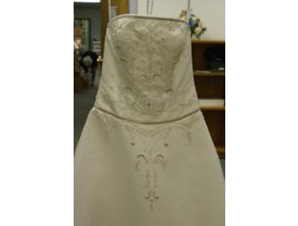 Dress: New, organza A-line strapless with beaded metallic embroidery on bodice and skirt. Style CT129 Ivory, size 12.