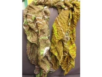 A hand dyed, olive, silk chiffon scarve/boa--wax resist and machine serged.