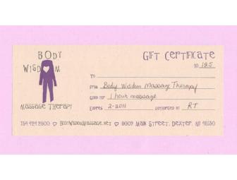 Gift certificate for a one hour massage. Body Wisdom Massage is located at 8009 Main St Dexter, MI 48130