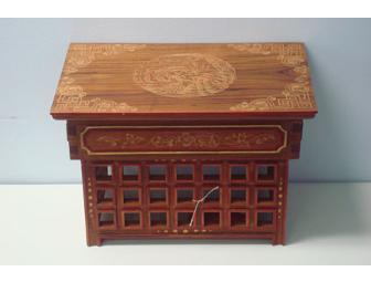 India, Norbulingka Institute. Wood polychrome. Hand carved & painted. 14 1/4" w x 9" d x 9 3/4" h. Collapsible. 14 ¼" x 9" x 3 ¾"".