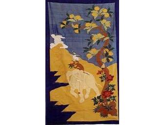 "The Four Friends"." India, Norbulingka Institute. An elephant, monkey, hare and a grouse set about to teach the animal kingdom how good conduct brings peace & harmony. Raw silk, hand sewn & embroidered appliqué wrapped thread technique. Cotton lined with raw silk trim. 4 hanging loops. 40" w x 76" h with 4 x 2" hanging loops.