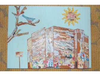 Materials/ Description of Process: Neutral shades of paper, pen, stain, wood cut-outs. Ms. Hennigan's kindergarten class created a unique "talking" wall hanging. Using their own words and verse describing what they love about Audubon, both the children and their parents helped create our masterpieces. Their thoughts were scanned, shaped, and decoupaged onto the school, branches, and the sun. This 18 x 24 work of art captures the innocence, optimism, and imagination of our children!