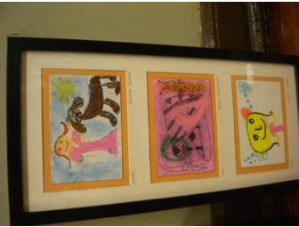 Materials/ Description of Process: Pastels, charcoal, illustration boards, colored pencils. Ms. Fernandez's 1st grade students explored the differences between abstract and representational art through the lens of conveying emotions and feelings. After reading Dr. Seuss' My Many Colored Days, examining an array of famous artworks, brainstorming a list of feelings and emotions, and differentiating between abstract and representational art, each 1st grader created two pieces of art representing a feeling or an emotion. One piece was representational; another was abstract. At least one of each 1st grader's 20x10 masterpieces is featured in the framed triplicates. These pieces of whimsy are sure to steal your heart.
