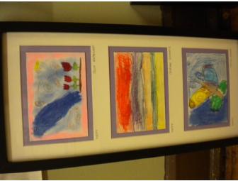 Materials/ Description of Process: Pastels, charcoal, illustration boards, colored pencils. Ms. Fernandez's 1st grade students explored the differences between abstract and representational art through the lens of conveying emotions and feelings. After reading Dr. Seuss' My Many Colored Days, examining an array of famous artworks, brainstorming a list of feelings and emotions, and differentiating between abstract and representational art, each 1st grader created two pieces of art representing a feeling or an emotion. One piece was representational; another was abstract. At least one of each 1st grader's 20x10 masterpieces is featured in the framed triplicates. These pieces of whimsy are sure to steal your heart.