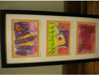 Materials/ Description of Process: Pastels, charcoal, illustration boards, colored pencils. Ms. Fernandez's 1st grade students explored the differences between abstract and representational art through the lens of conveying emotions and feelings. After reading Dr. Seuss' My Many Colored Days, examining an array of famous artworks, brainstorming a list of feelings and emotions, and differentiating between abstract and representational art, each 1st grader created two pieces of art representing a feeling or an emotion. One piece was representational; another was abstract. At least one of each 1st grader's 20x10 masterpieces is featured in the framed triplicates. These pieces of whimsy are sure to steal your heart.