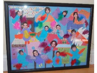 Materials/ Description of Process: Poster board, card stock, construction paper, feathers, markers, photos, and glue. Ms. Harbottle's 2nd graders explored Audubon's bird theme through art. After studying texture and patterns, they stayed true to the spirit of Audubon and created their very own birdhouses! Afterward, each student created a bird to represent his or herself. Each student's face is attached to the bird he or she created, resulting in 2 framed 30 x 24 collages of Audubon's very own unique 2nd grade birds!