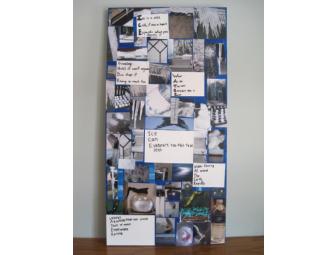Materials/ Description of Process: Acrylic paint, photographs, paper on canvas. Following their science unit on water, Ms. Berin's third grade students each composed poetry about water, took over 100 photographs of various forms and sources of water. Groups of students then painted two canvases, cropped pictures, printed the poetry, and arranged the final collages, creating 2 pieces measuring approximately 15 x 30. This is a critically thoughtful artistic display of our planetís most treasured resource!
